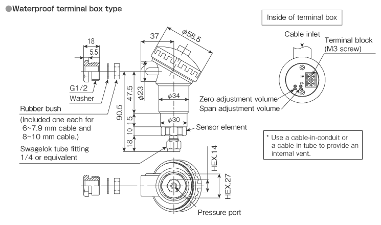 | Cable | 4- or 2-core shielded (oilproof) cable 2m(Standard) φ6mm Cable in tube is used for the gauge pressure model of waterproof connector and pigtail types |