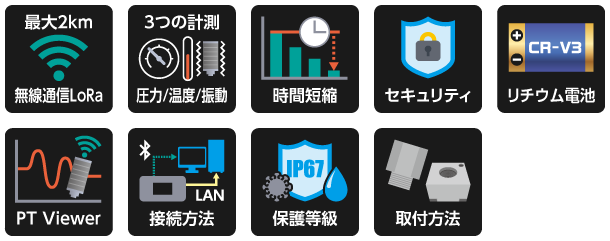 | 電池寿命 | 約2.5年(圧力・温度測定時 1回/1h測定、1回/5s受信) 約2.5年(圧力・温度・振動測定時 1回/1h測定、1回/30s受信) |