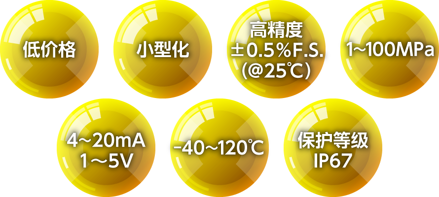 针对中·高压范围1~100MPa特制的VMSI/VMSV系列放大器内置压力传感器,不仅设计紧凑且轻量,还可在高精度±0.5%F.S.(@25°C)·−40~120°C的条件下使用。此外,在防护等级IP67·抗振性·抗冲击性方面都很出色,真正是一款全能型的放大器内置压力传感器。